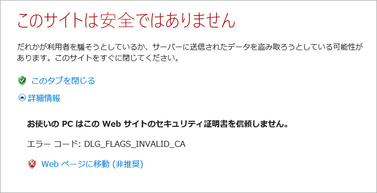 「お使いの PC はこの Web サイトのセキュリティ証明書を信頼しません。」